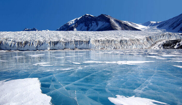 Image: Antarctica: The blue ice covering Lake Fryxell, in the Transantarctic Mountains, comes from glacial meltwater from the Canada Glacier and other smaller glaciers. The freshwater stays on top of the lake and freezes, sealing in briny water below.