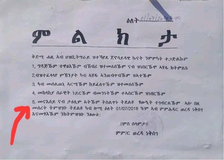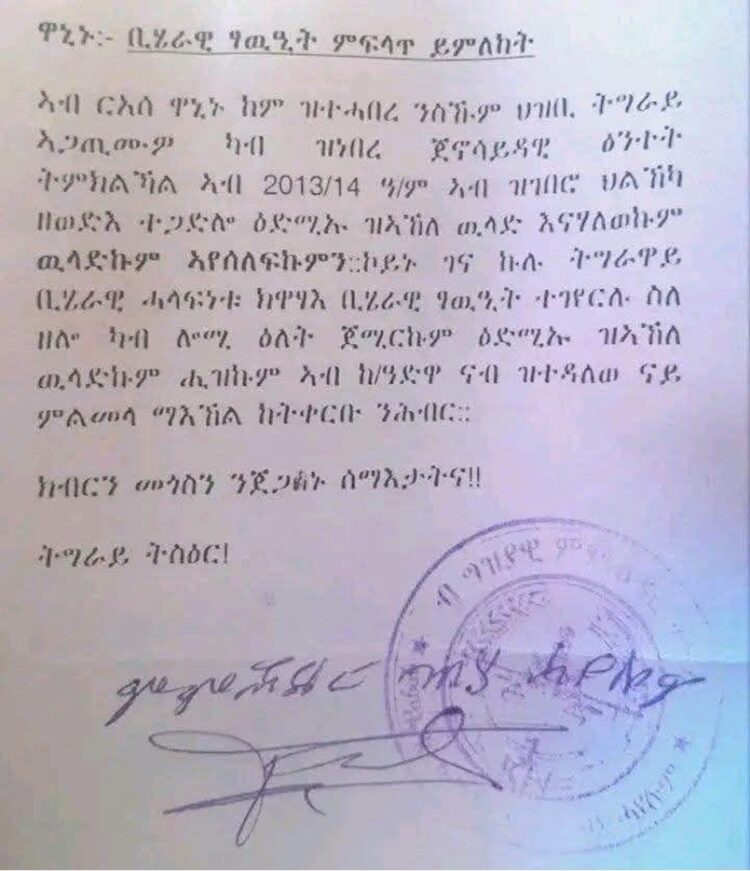 As indicated in the subject, you didn’t send your children who were in the age of military service during the genocidal war that the people of Tigray faced in 2020/2021. As the people of Tigray have been called to fulfill their national responsibility, we order you to take your children who are at the age of military service to the mobilization center prepared in Adwa town.